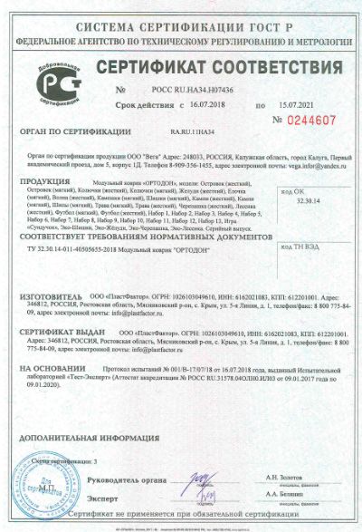 Уважаемые покупатели! Доводим до вашего сведения, что в продаже появились массажные коврики под такими же названиями (трава, шипы, шишки) как и массажные коврики ОРТО, но совершенно не имеющие ничего общего с оригиналом. Эти коврики имеют жёсткую, агрессивную стимулирующую поверхность, что не только может отпугнуть ребёнка при вставании на них, но и вызвать болезненные ощущения при ходьбе и топтании на таких "массажных" ковриках , а это может нанести вред эмоциональному состоянию вашего малыша, и не о какой пользе для формирования правильной стопы и правильной походки речи идти не может!!! Наши коврики имеют соответствующии сертификат ортопедического изделия.